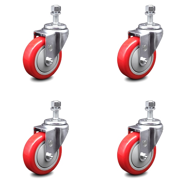 4 Inch Red Polyurethane Wheel Swivel 12mm Threaded Stem Caster Set SCC