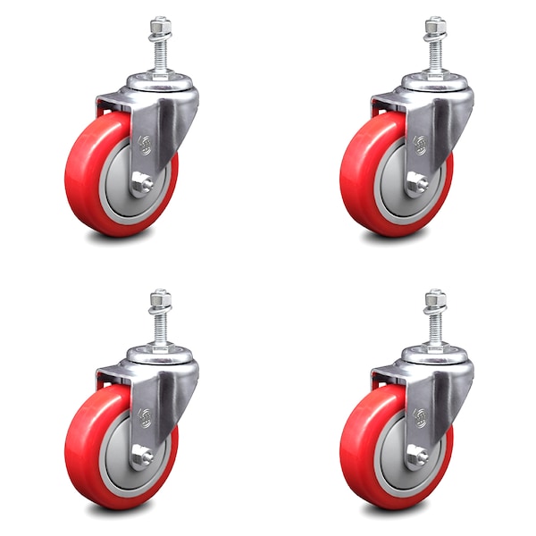 4 Inch Red Polyurethane Wheel Swivel 3/8 Inch Threaded Stem Caster Set SCC