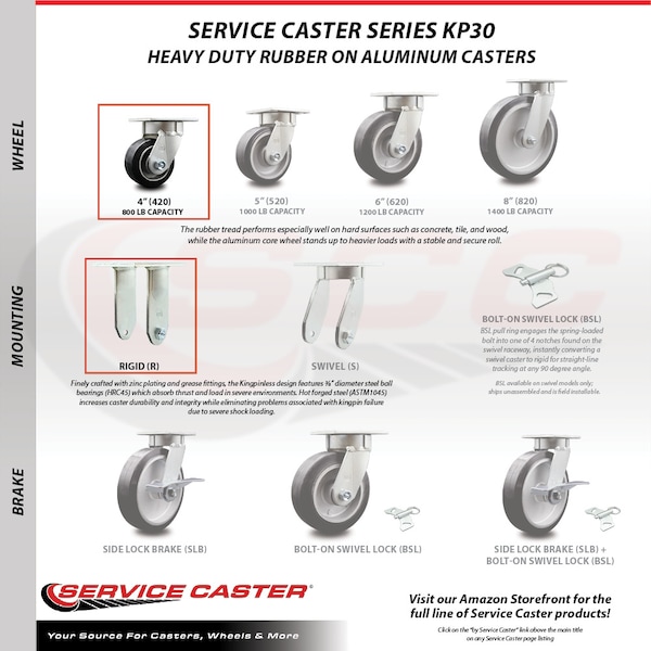 Listing is for one (1) Service Caster Series #30 rigid caster with a 4" diameter, 2" wide moldon rubber tread set on a aluminum core wheel. Supports 400 pounds (lbs) per caster.When searching for a reliable and durable solution for medium and heavy duty projects, consider Service Caster’s Series 30 top plate rubber on aluminum wheel casters. The Service Caster Series #30 is ideal for material handling, carts, equipment, and shop projects. The rubber tread performs especially well on hard surfaces such as concrete, tile, and wood, while the aluminum core wheel stands up to heavier loads with a stable and secure roll. Finely crafted with double ball bearing heat treated raceways, these versatile casters are ideal for a wide range of applications, such as dollies, platform trucks, warehouse carts and freight terminals. Or ensure a smooth and secure ride for food service carts, hotel housekeeping carts, and industrial and commercial equipment. Even drywall carts, welding carts, and wall panel carts will be ready to roll on the Series 30, keeping you moving forward. Service Caster is unsurpassed in quality, reliability, and excellent customer service. Count on us to move you forward.