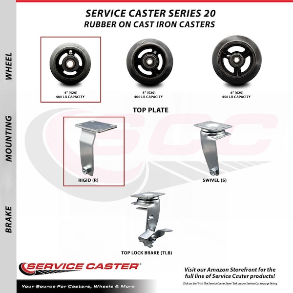 Listing is for a set of four (4) Service Caster Series #20 casters, two (2) rigid and two (2) swivel casters with top locking brakes, with 4" diameter by 2" wide rubber on cast iron wheel and roller bearings capable of supporting a total weight of 1,400 lbs. (400 lbs./caster). When searching for a reliable and durable solution for light and medium duty projects, consider Service Caster’s Series 20 top plate rubber on metal casters. The Service Caster Series #20 is ideal for material handling, carts, equipment, and shop projects. The rubber tread performs especially well on hard surfaces such as concrete, tile, and wood, while the metal core wheel stands up to heavier loads with a stable and secure roll. Finely crafted with double ball bearing heat treated raceways, these versatile casters are ideal for a wide range of applications, such as dollies, platform trucks, warehouse carts and freight terminals. Or ensure a smooth and secure ride for food service carts, hotel housekeeping carts, and industrial and commercial equipment. Even drywall carts, welding carts, and wall panel carts will be ready to roll on the Series 20, keeping you moving forward. Service Caster is unsurpassed in quality, reliability, and excellent customer service. Count on us to move you forward.