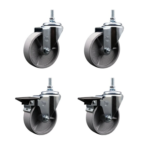 Listing is for a set of four 4 Service Caster Series 20 casters, two 2 swivel 12MM threaded stem with brake casters and two 2 swivel casters, with 4 diameter by 114 wide semi steel cast iron wheels Supports a total weight of 1,200lbs 300lbsper caster When searching for a reliable and durable solution to your caster needs, consider Service Casters Series 20 sleeve bearing semisteel cast iron casters The Service Caster Series 20 is ideal for light and medium duty material handling, carts, equipment, and shop projects The zinc plated finish provides durability under any condition, while the semisteel wheels are abrasion resistant and rugged, maintaining effortless rolling under heavier loads, and provides a costeffective solution over steel wheels Sleeve bearings provide a metal sleeve inserted in a wheel to rest directly on the axle This option is only recommended when rolling ease is less critical Mounting options include top plate, bolt hole and standard and metric threaded stem sizes