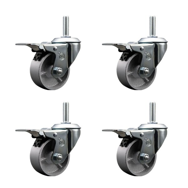 Listing is for a set of four 4 Service Caster Series 20 swivel casters, four 4 swivel 58 threaded stem casters with total lock brakes, 4 diameter by 112 wide semi steel cast iron wheels Supports a total weight of 1,200lbs 300lbsper caster When searching for a reliable and durable solution to your caster needs, consider Service Casters Series 20 roller bearing semisteel cast iron casters The Service Caster Series 20 is ideal for light and medium duty material handling, carts, equipment, and shop projects The zinc plated finish provides durability under any condition, while the semisteel wheels are abrasion resistant and rugged, maintaining effortless rolling under heavier loads, and provides a costeffective solution over steel wheels The roller bearing is capable of carrying greater loads while also providing smoother rolling motion It has a split outer race shell into which the roller assembly is inserted Combination sealthrust retainer washers protect the bearing from dirt, water, and chemicals They also help absorb thrust friction Note roller bearing must be used with hardened spanner bushing or hardened shaft Mounting options include top plate, bolt hole and standard and metric threaded stem sizes