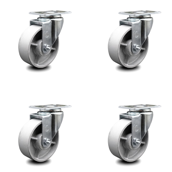 Listing is for a set of four (4) Service Caster Series #20 swivel casters, four (4) swivel casters with 4” diameter by 1-1/2” wide semi steel cast iron wheels. Supports a total weight of 1,200lbs (300lbs/per caster). When searching for a reliable and durable solution to your caster needs, consider Service Caster’s Series 20 roller bearing semi-steel cast iron casters. The Service Caster Series #20 is ideal for light and medium duty material handling, carts, equipment, and shop projects. The zinc plated finish provides durability under any condition, while the semi-steel wheels are abrasion resistant and rugged, maintaining effortless rolling under heavier loads, and provides a cost-effective solution over steel wheels. The roller bearing is capable of carrying greater loads while also providing smoother rolling motion. It has a split outer race shell into which the roller assembly is inserted. Combination seal/thrust retainer washers protect the bearing from dirt, water, and chemicals. They also help absorb thrust friction (Note: roller bearing must be used with hardened spanner bushing or hardened shaft). Mounting options include top plate, bolt hole and standard and metric threaded stem sizes. Service Caster is unsurpassed in quality, reliability, and excellent customer service. Count on us to move you forward.