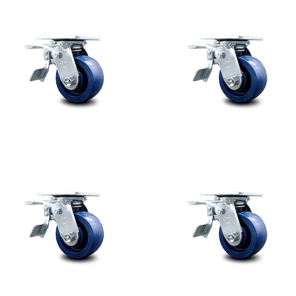 Listing is for a set of four (4) Service Caster Series #30 swivel casters with 4" diameter by 2" wide solid polyurethane wheels with total lock brakes capable of supporting a total weight of 2,800 lbs. (700 lbs. per caster). When searching for a reliable and durable solution to your caster needs, consider Service Caster's Series 30 top plate solid polyurethane wheel casters. The Service Caster Series #30 features a non-marking, non-marring polyurethane wheel. Molded as one solid piece, this wheel is free from debonding, and will not flat spot, as can occur with comparable polyurethane wheels, ensuring a smooth and solid roll over long periods of time. These versatile casters are ideal for a wide range of applications, such as dollies, platform trucks, warehouse carts and freight terminals. Or ensure a secure ride for food service carts, hotel housekeeping carts, and industrial and commercial equipment. Even drywall carts, welding carts, and wall panel carts will be ready to roll on the Series 30, keeping you moving forward. Service Caster is unsurpassed in quality, reliability, and excellent customer service. Count on us to move you forward.