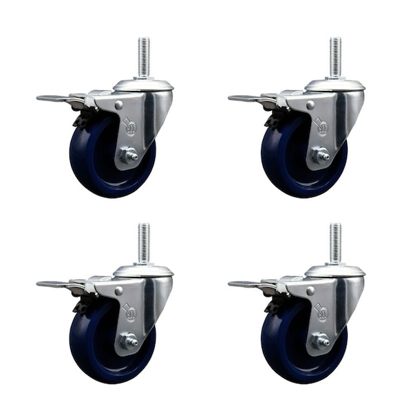 4 Inch Solid Polyurethane Swivel 58 Inch Threaded Stem Caster Set with Total Lock Brake