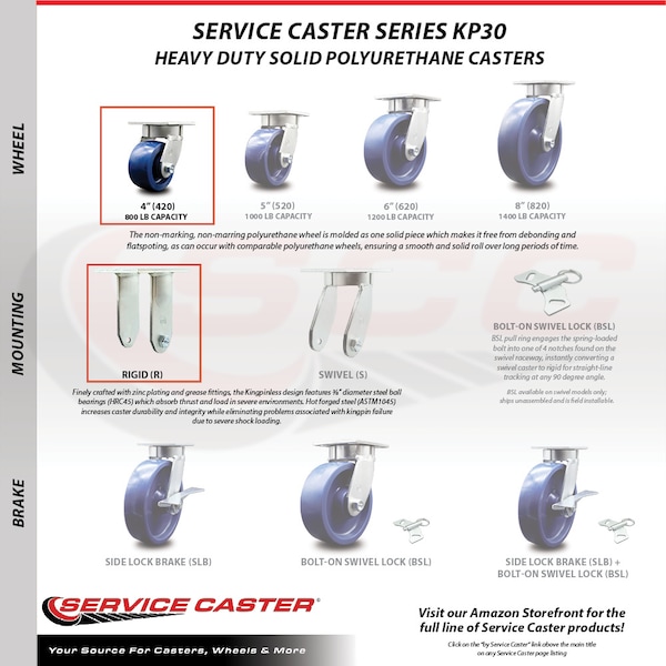 Listing is for one (1) Service Caster Series #30 rigid caster with a 4" diameter, 2" wide solid blue polyurethane wheel and maintenance free precision ball wheel bearings. Supports 700 pounds (lbs) per caster. When searching for a reliable and durable solution to your caster needs, consider Service Caster's Series 30 top plate solid polyurethane wheel casters. The Service Caster Series #30 features a non-marking, non-marring polyurethane wheel. Molded as one solid piece, this wheel is free from debonding, and will not flat spot, as can occur with comparable polyurethane wheels, ensuring a smooth and solid roll over long periods of time. These versatile casters are ideal for a wide range of applications, such as dollies, platform trucks, warehouse carts and freight terminals. Or ensure a secure ride for food service carts, hotel housekeeping carts, and industrial and commercial equipment. Even drywall carts, welding carts, and wall panel carts will be ready to roll on the Series 30, keeping you moving forward. Service Caster is unsurpassed in quality, reliability, and excellent customer service. Count on us to move you forward.