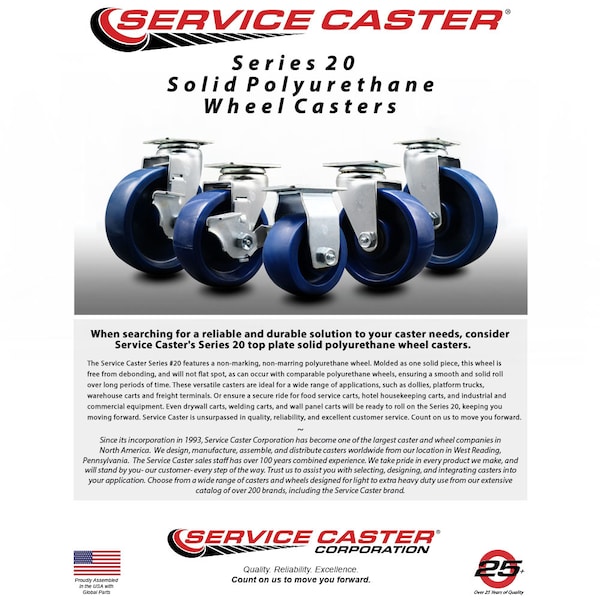 Listing is for one (1) Service Caster Series #20 rigid caster with a 4" diameter by 2" wide solid polyurethane wheel and maintenance free precision ball wheel bearing capable of supporting 450lbs./caster. When searching for a reliable and durable solution to your caster needs, consider Service Caster's Series 20 top plate solid polyurethane wheel casters. The Service Caster Series #20 features a non-marking, non-marring polyurethane wheel. Molded as one solid piece, this wheel is free from debonding, and will not flat spot, as can occur with comparable polyurethane wheels, ensuring a smooth and solid roll over long periods of time. These versatile casters are ideal for a wide range of applications, such as dollies, platform trucks, warehouse carts and freight terminals. Or ensure a secure ride for food service carts, hotel housekeeping carts, and industrial and commercial equipment. Even drywall carts, welding carts, and wall panel carts will be ready to roll on the Series 20, keeping you moving forward. Service Caster is unsurpassed in quality, reliability, and excellent customer service. Count on us to move you forward.