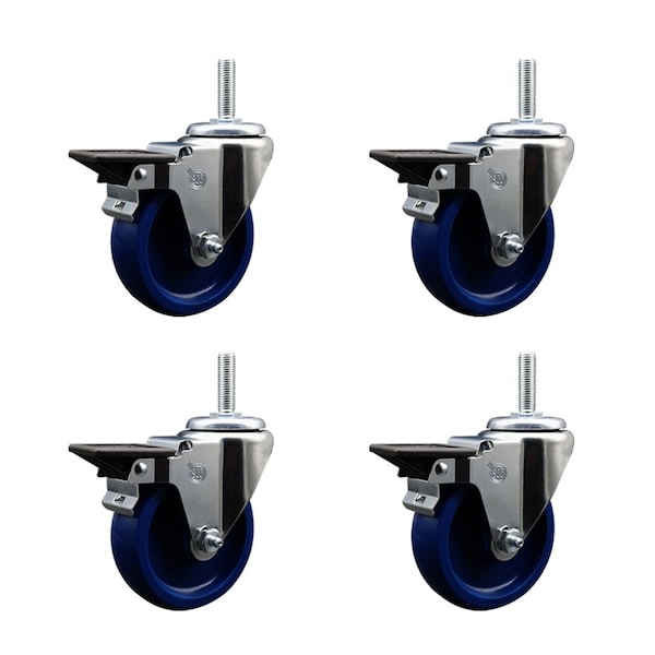 4 Inch Solid Polyurethane Wheel Swivel 34 Inch Threaded Stem Caster Set with Brake SCC