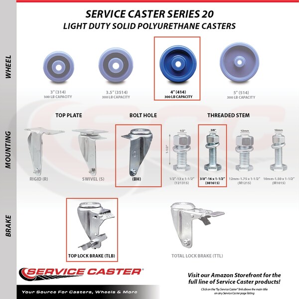 Listing is for one (1) Service Caster Series #20 swivel caster with a 4" diameter by 1-1/4" wide solid polyurethane wheel and a 3/8" threaded stem with brake capable of supporting 300 lbs./caster.The Service Caster Series #20 is ideal for light and medium duty material handling, carts, equipment, and shop projects. The zinc plated finish provides durability under any condition. And the non-marking, non-marring polyurethane wheel is molded as one solid piece, making it free from debonding. This ensures the wheel will not flat spot, as can occur with comparable polyurethane wheels, resulting in a smooth and solid roll over long periods of time. Mounting options include top plate, bolt hole and standard and metric threaded stem sizes. Service Caster is unsurpassed in quality, reliability, and excellent customer service. Count on us to move you forward.