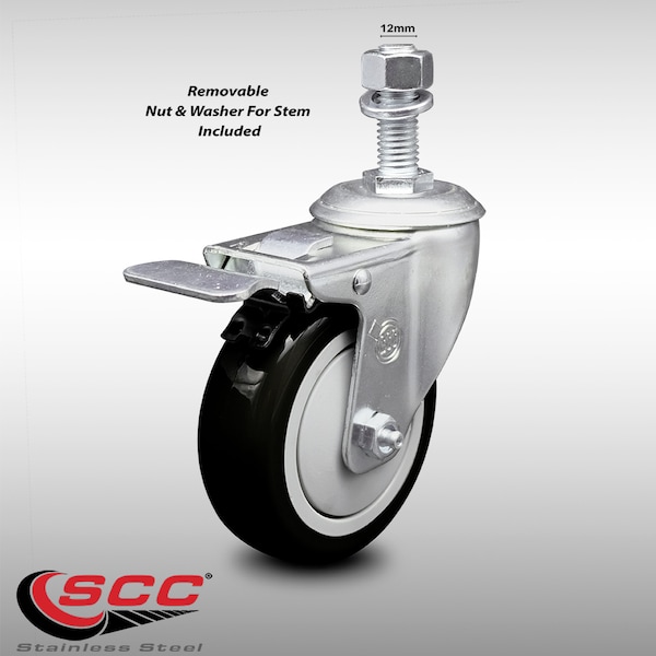 Listing is for one (1) Service Caster Series #20 stainless steel swivel caster with a 4" diameter by 1-1/4" wide Black polyurethane wheel and a 12mm-1.75 X 1-1/2" metric threaded stem with a total lock brake capable of supporting 300 lbs./caster.When searching for a reliable and durable solution to your caster needs, consider Service Caster’s Series 20 stainless steel threaded stem polyurethane casters. The Service Caster Series #20 is ideal for light and medium duty material handling, carts, equipment, and shop projects. The threaded stem is available in standard or metric sizes and ensures a solid and secure attachment. The polished stainless steel finish provides durability under any condition, while the non-marking, non-marring polyurethane wheels perform especially well on hard surfaces such as concrete, tile, and wood. All rolling via a finely crafted ball bearing design that will keep you moving forward. Service Caster is unsurpassed in quality, reliability, and excellent customer service. Count on us to move you forward.