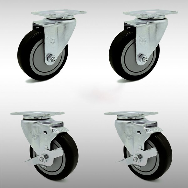 4 Inch SS Black Polyurethane Swivel Top Plate Caster Set with 2 Brakes SCC