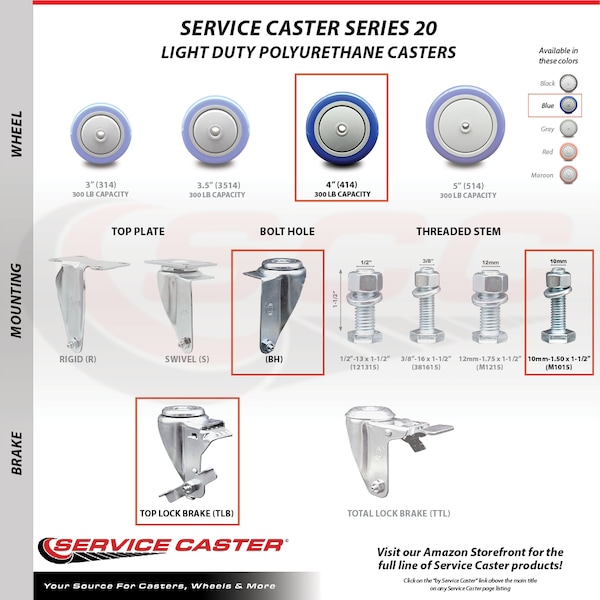 Listing is for one (1) Service Caster Series #20 stainless steel swivel caster with a 4" diameter by 1-1/4" wide blue polyurethane wheel and a 10mm-1.50 X 1-1/2" metric threaded stem with a brake capable of supporting 300 lbs./caster.When searching for a reliable and durable solution to your caster needs, consider Service Caster’s Series 20 stainless steel threaded stem polyurethane casters. The Service Caster Series #20 is ideal for light and medium duty material handling, carts, equipment, and shop projects. The threaded stem is available in standard or metric sizes and ensures a solid and secure attachment. The polished stainless steel finish provides durability under any condition, while the non-marking, non-marring polyurethane wheels perform especially well on hard surfaces such as concrete, tile, and wood. All rolling via a finely crafted ball bearing design that will keep you moving forward. Service Caster is unsurpassed in quality, reliability, and excellent customer service. Count on us to move you forward.