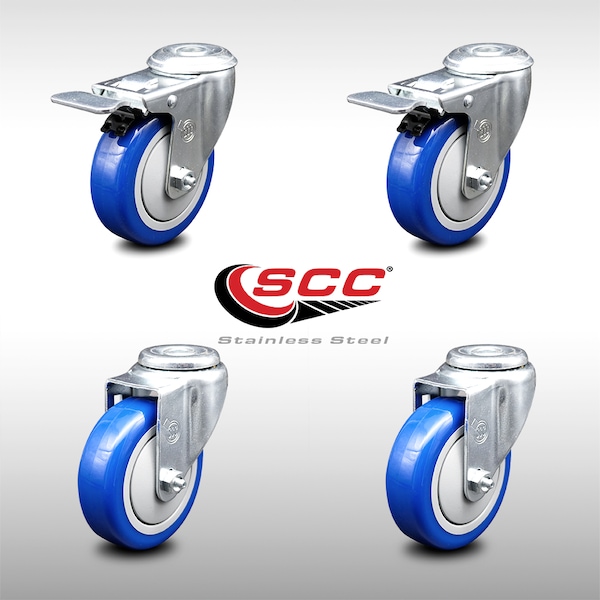 4 Inch SS Blue Polyurethane Swivel Bolt Hole Caster Set with 2 Total Lock Brake