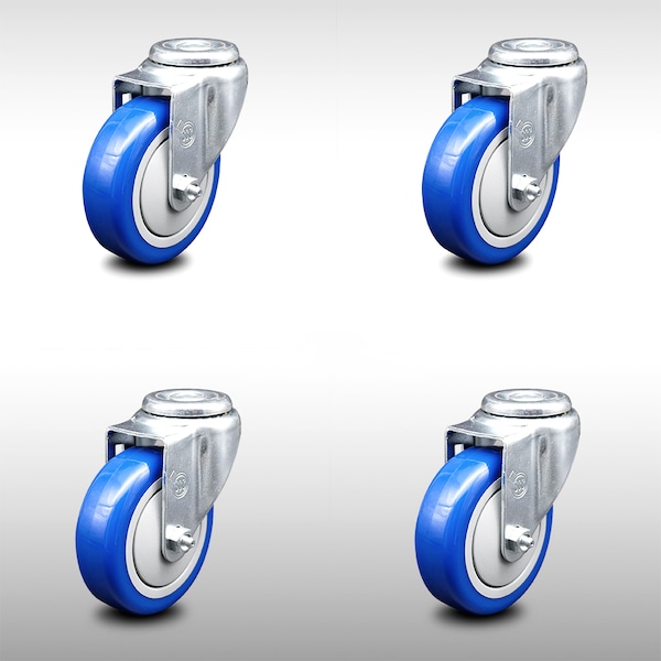 4 Inch SS Blue Polyurethane Wheel Swivel Bolt Hole Caster Set