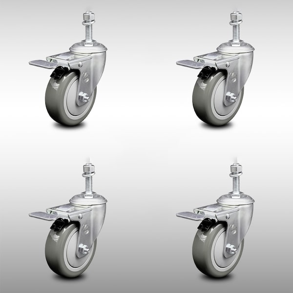4 Inch SS Gray Polyurethane 10mm Threaded Stem Caster Set Total Lock Brake