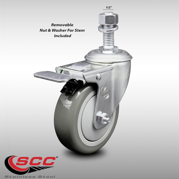 4 Inch SS Gray Polyurethane 1/2 Inch Threaded Stem Caster with Total Lock Brake
