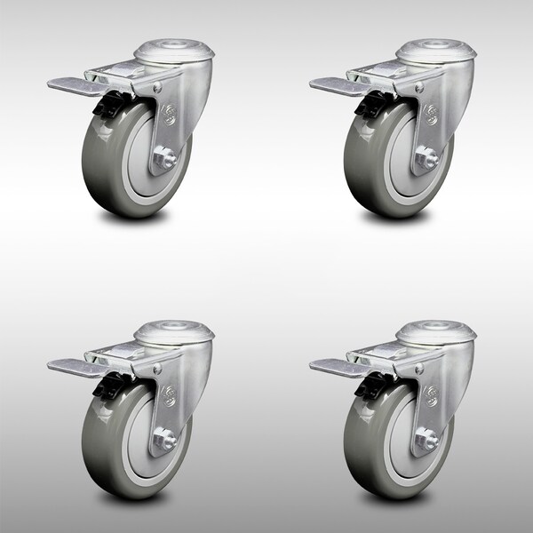 4 Inch SS Gray Polyurethane Swivel Bolt Hole Caster Set with Total Lock Brake
