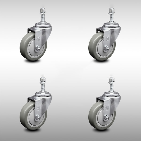 4 Inch SS Gray Polyurethane Wheel Swivel 10mm Threaded Stem Caster Set SCC