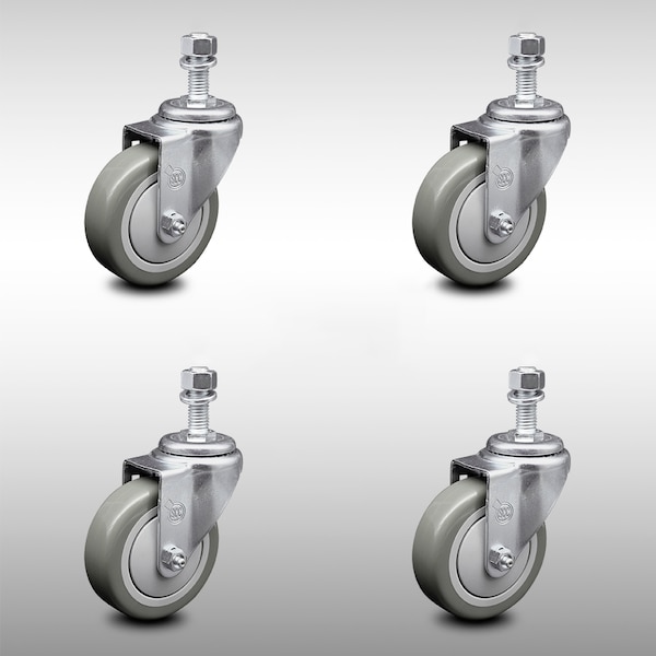 4 Inch SS Gray Polyurethane Wheel Swivel 12mm Threaded Stem Caster Set SCC