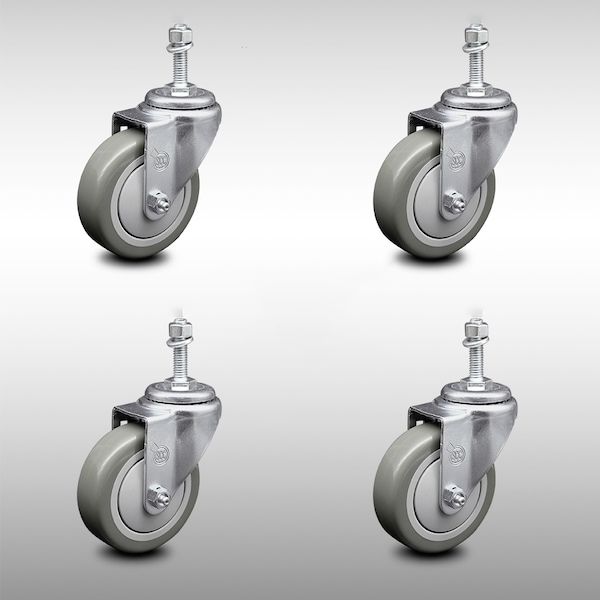 4 Inch SS Gray Polyurethane Wheel Swivel 3/8 Inch Threaded Stem Caster Set SCC