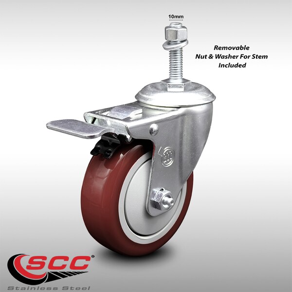4 Inch SS Maroon Polyurethane 10mm Threaded Stem Caster Total Lock Brake SCC