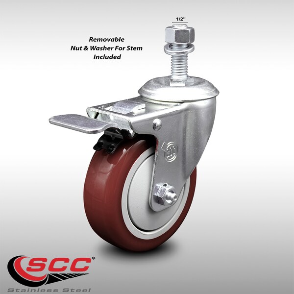 4 Inch SS Maroon Polyurethane 1/2 Inch Threaded Stem Caster with Total Lock Brake