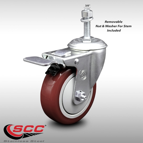4 Inch SS Maroon Polyurethane 3/8 Inch Threaded Stem Caster Total Lock Brake SCC