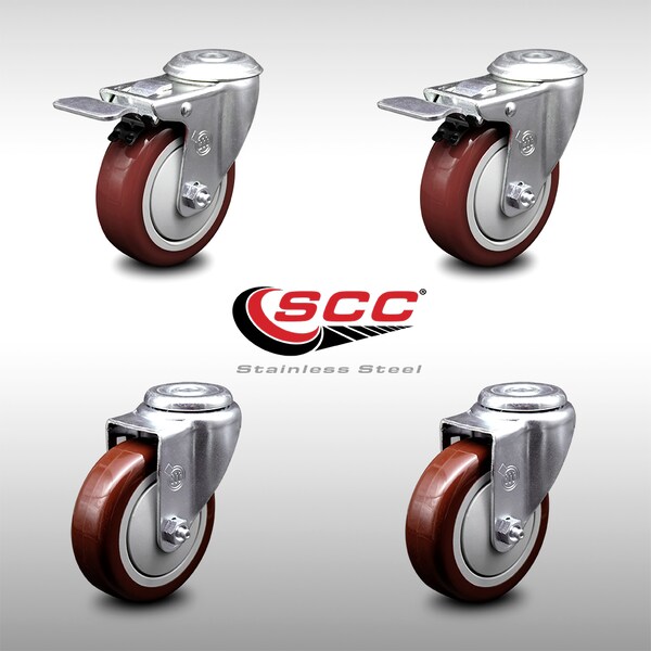 4 Inch SS Maroon Polyurethane Bolt Hole Caster Set with 2 Total Lock Brake SCC
