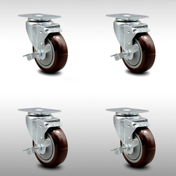 4 Inch SS Maroon Polyurethane Swivel Top Plate Caster Set with Brake SCC