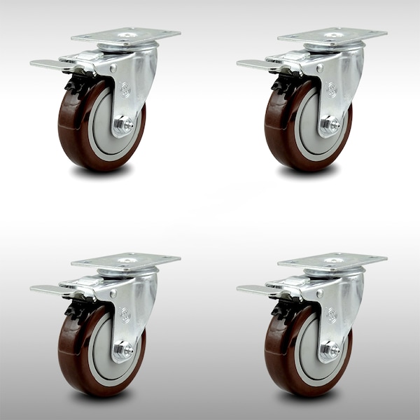 4 Inch SS Maroon Polyurethane Top Plate Caster Set Total Lock Brake SCC