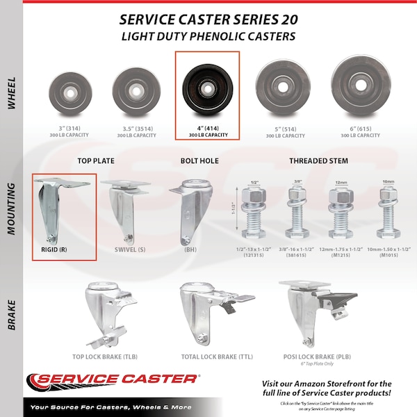 Listing is for a set of four (4) Service Caster Series #20 stainless steel casters, two (2) swivel total lock brake casters and two (2) rigid casters, with 4” diameter by 1-1/4” wide phenolic wheels. Supports a total weight of 1,200lbs (300lbs/per caster).When searching for a reliable and durable solution to your caster needs, consider Service Caster’s Series 20 phenolic casters. The Service Caster Series #20 is ideal for light and medium duty material handling, carts, equipment, and shop projects. The phenolic wheels have a high resistance to impact damage while providing protection for floors in commercial and industrial settings. Phenolic wheels not only provide higher load capacities and impact resistance than comparable wheels, but are also resistant to most chemicals and oils. Mounting options include top plate, bolt hole and standard and metric threaded stem sizes. All rolling on a finely crafted ball bearing design and zinc plated finish that provides durability under any condition and keeps you safely moving forward. Service Caster is unsurpassed in quality, reliability, and excellent customer service. Count on us to move you forward.