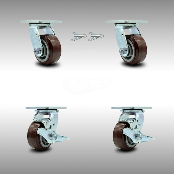 4 Inch SS Polyurethane Caster Set with Roller Bearings 2 Swivel Lock 2 Brake SCC