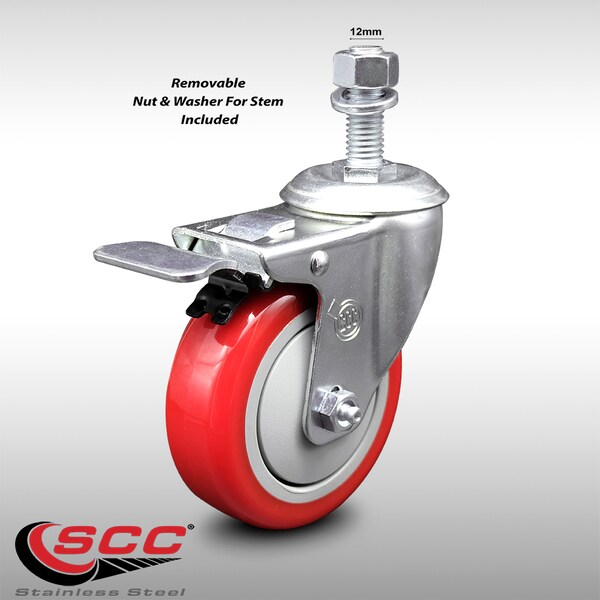 Listing is for one (1) Service Caster Series #20 stainless steel swivel caster with a 4" diameter by 1-1/4" wide red polyurethane wheel and a 12mm-1.75 X 1-1/2" metric threaded stem with a total lock brake capable of supporting 300 lbs./caster.When searching for a reliable and durable solution to your caster needs, consider Service Caster’s Series 20 stainless steel threaded stem polyurethane casters. The Service Caster Series #20 is ideal for light and medium duty material handling, carts, equipment, and shop projects. The threaded stem is available in standard or metric sizes and ensures a solid and secure attachment. The polished stainless steel finish provides durability under any condition, while the non-marking, non-marring polyurethane wheels perform especially well on hard surfaces such as concrete, tile, and wood. All rolling via a finely crafted ball bearing design that will keep you moving forward. Service Caster is unsurpassed in quality, reliability, and excellent customer service. Count on us to move you forward.
