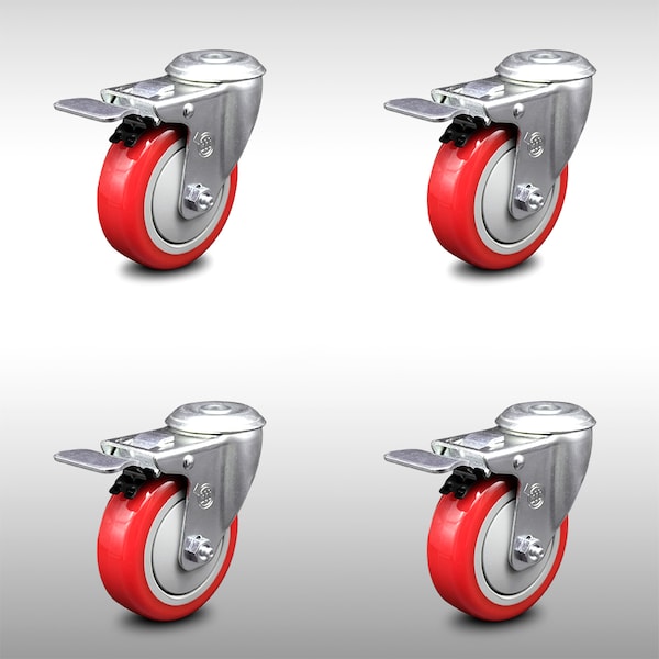 4 Inch SS Red Polyurethane Swivel Bolt Hole Caster Set with Total Lock Brake