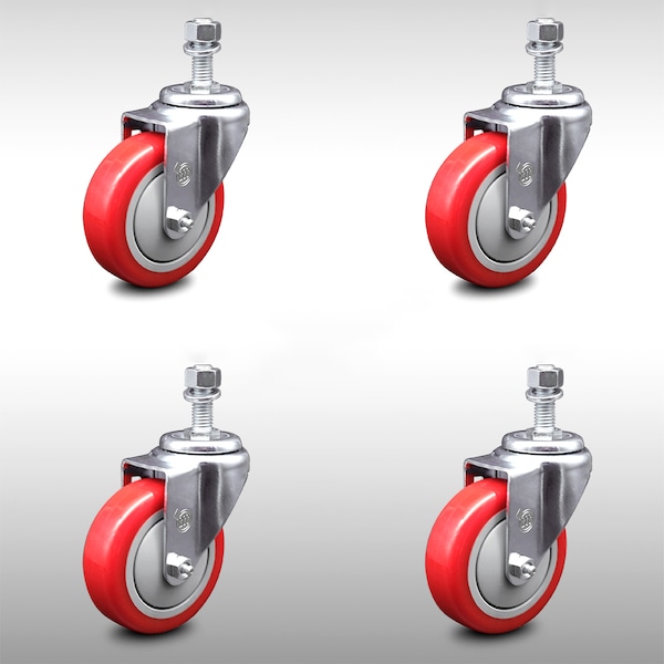 4 Inch SS Red Polyurethane Wheel Swivel 12mm Threaded Stem Caster Set SCC