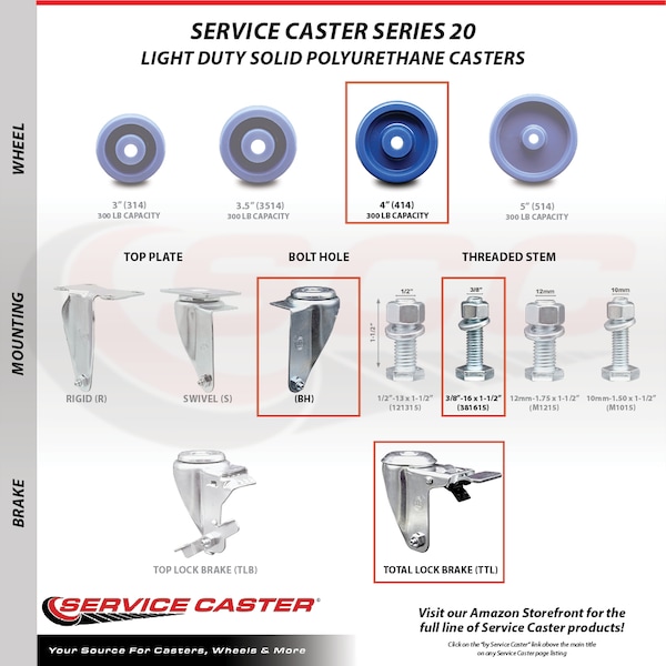 Listing is for a set of four (4) Service Caster Series #20 stainless steel swivel casters, four (4) swivel 3/8" threaded stem casters with total lock brakes, 4” diameter by 1-1/4” wide solid polyurethane wheels. Supports a total weight of 1,200lbs (300lbs/per caster). The Service Caster Series #20 is ideal for light and medium duty material handling, carts, equipment, and shop projects. The zinc plated finish provides durability under any condition. And the non-marking, non-marring polyurethane wheel is molded as one solid piece, making it free from debonding. This ensures the wheel will not flat spot, as can occur with comparable polyurethane wheels, resulting in a smooth and solid roll over long periods of time. Mounting options include top plate, bolt hole and standard and metric threaded stem sizes. Service Caster is unsurpassed in quality, reliability, and excellent customer service. Count on us to move you forward.