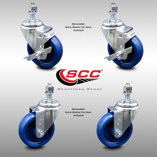 4 Inch SS Solid Polyurethane Swivel 12mm Threaded Stem Caster Brakes, 2PK