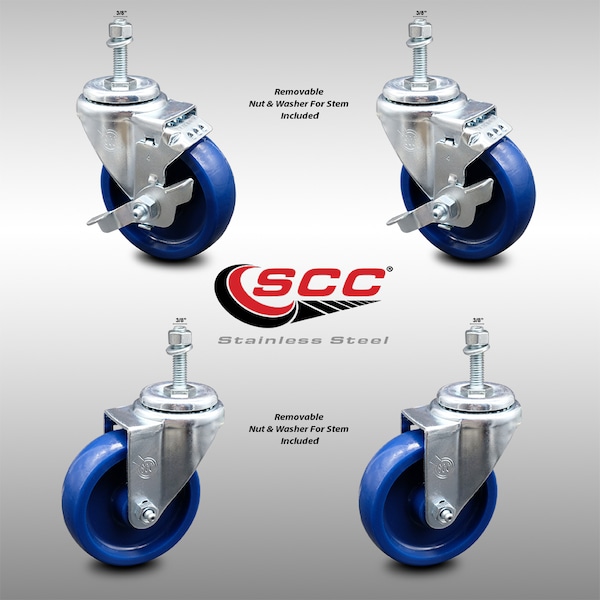 4 Inch SS Solid Polyurethane Swivel 3/8 Inch Threaded Stem Caster Brakes, 2PK
