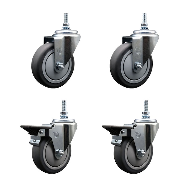 4 Inch Thermoplastic Rubber 12 MM Threaded Stem Caster Set 2 Brakes SCC
