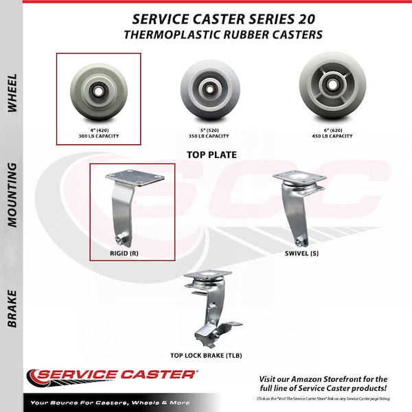 Listing is for a set of four (4) Service Caster Series #20 casters, two (2) rigid and two (2) swivel casters with top locking brakes, with 4" diameter by 2" wide thermoplastic rubber donut tread wheel and roller bearings capable of supporting a total weight of 1,200 lbs. (300 lbs./caster). When searching for a reliable and durable solution for light and medium duty projects, consider Service Caster’s Series 20 top plate thermoplastic rubber donut tread on polyolefin core casters. The rounded face "donut" style soft tread is made of thermoplastic rubber that is non-marking, non-marring and provides easier mobility over standard flat tread wheels, resulting in a long lasting, high capacity wheel capable of easy rolling under heavy loads. Finely crafted with double ball bearing heat treated raceways, these versatile casters are ideal for a wide range of applications, such as dollies, platform trucks, warehouse carts and freight terminals. Or ensure a smooth and secure ride for food service carts, hotel housekeeping carts, and industrial and commercial equipment. Even drywall carts, welding carts, and wall panel carts will be ready to roll on the Series 20, keeping you moving forward. Service Caster is unsurpassed in quality, reliability, and excellent customer service. Count on us to move you forward.