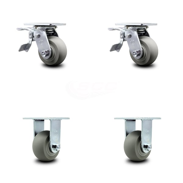 4 Inch Thermoplastic Rubber Caster Set with Roller Bearings 2 Brakes 2 Rigid SCC