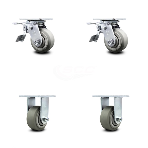 4 Inch Thermoplastic Rubber Caster Set with Roller Bearings 2 Brakes 2 Rigid SCC