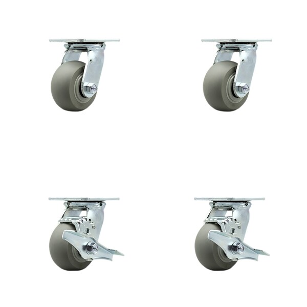 4 Inch Thermoplastic Rubber Swivel Caster Set with Roller Bearings 2 Brakes SCC