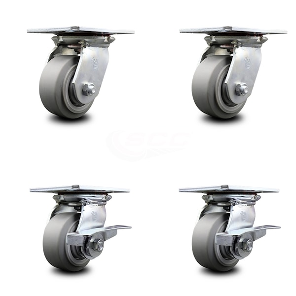 4 Inch Thermoplastic Rubber Swivel Caster Set with Roller Bearings 2 Brakes SCC