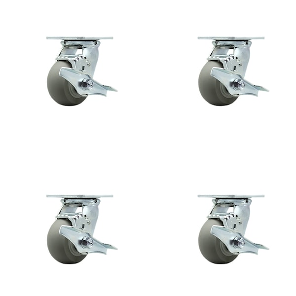 4 Inch Thermoplastic Rubber Swivel Caster Set with Roller Bearings and Brake SCC