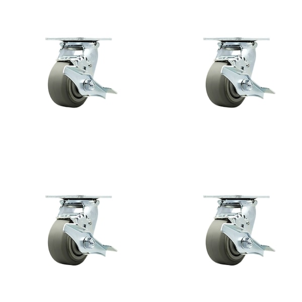4 Inch Thermoplastic Rubber Swivel Caster Set with Roller Bearings and Brake SCC