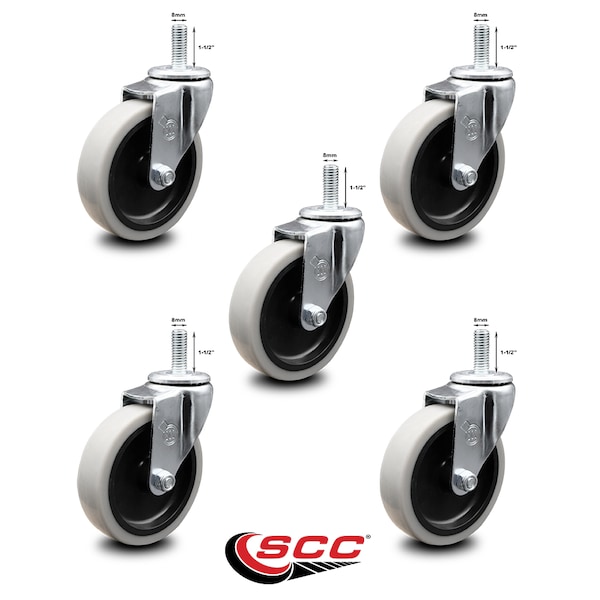 4 Inch Thermoplastic Rubber Wheel 8mm Threaded Stem Caster SCC, 5PK