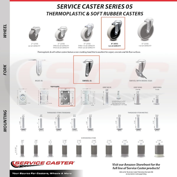 Listing is for a 4" diameter thermoplastic rubber wheel with a 2-3/8” x 3-5/8” swivel top plate. Supports up to 125lbs. When searching for a reliable and durable solution to your furniture needs, consider Service Caster’s Series 05 polyurethane, thermoplastic & soft rubber casters. The Service Caster 05 series is ideal for light duty applications, and is the perfect solution as new or replacement parts for chairs, tables, medical carts and other home and office furniture. This durable caster provides easy maneuverability for a smooth and quiet ride, and features dual ball bearing heat treated raceway construction, with a zinc plated finish that provides durability under any condition. Wheels are available in non-marking polyurethane, thermoplastic rubber and soft rubber, excellent for carpet, concrete and tile floor surfaces. Mounting options include top plate, grip neck, grip ring and standard and metric threaded stem sizes. Also, the innovative expanding stem, that can easily adapt to the inside diameter of an opening, allowing for a secure fit in round or square tubes.