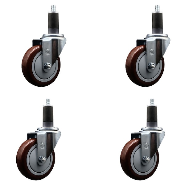 Listing is for a set of four 4 Service Caster Series #20 1-1/4'' expanding stem swivel casters with 4'' diameter by 1-1/4'' wide maroon polyurethane wheels capable of supporting a total weight of 1,400 lbs. 350 lbs./caster.. When searching for a reliable and durable solution to your caster needs, look no further than the Service Caster Series 20 expanding stem maroon polyurethane wheel casters. The Series #20 features an innovative expanding stem that can easily adapt to the inside diameter of the opening, allowing for a secure fit in round or square tubes. Simply tighten the topmost knurled nut to compress the rubber for a snug fit. For added security, further compress the rubber with a wrench via the nut under the swivel raceway. Finely crafted with a bright zinc plated finish, heat-treated ball bearing raceway, and a maroon polyurethane wheel, this versatile caster is ideal for work tables, shop projects, or any equipment with round or square tube legs. Service Caster is unsurpassed in quality, reliability, and excellent customer service. Count on us to move you forward.