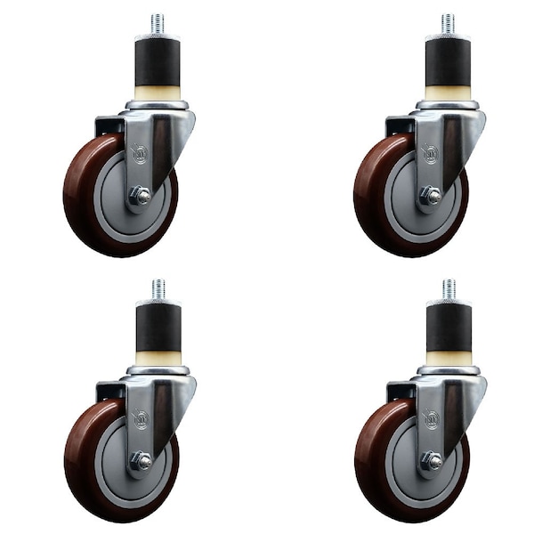 Listing is for a set of four 4 Service Caster Series #20 1-7/8'' expanding stem swivel casters with 4'' diameter by 1-1/4'' wide maroon polyurethane wheels capable of supporting a total weight of 1,400 lbs. 350 lbs./caster.. When searching for a reliable and durable solution to your caster needs, look no further than the Service Caster Series 20 expanding stem maroon polyurethane wheel casters. The Series #20 features an innovative expanding stem that can easily adapt to the inside diameter of the opening, allowing for a secure fit in round or square tubes. Simply tighten the topmost knurled nut to compress the rubber for a snug fit. For added security, further compress the rubber with a wrench via the nut under the swivel raceway. Finely crafted with a bright zinc plated finish, heat-treated ball bearing raceway, and a maroon polyurethane wheel, this versatile caster is ideal for work tables, shop projects, or any equipment with round or square tube legs. Service Caster is unsurpassed in quality, reliability, and excellent customer service. Count on us to move you forward.
